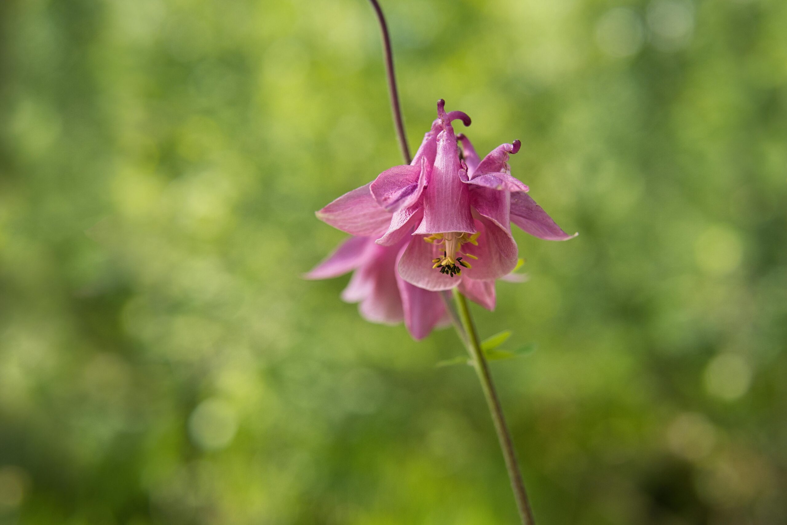 Zbliżenie różowego kwiatu orlika w bujnym wiosennym lesie, ukazujące żywe piękno natury.