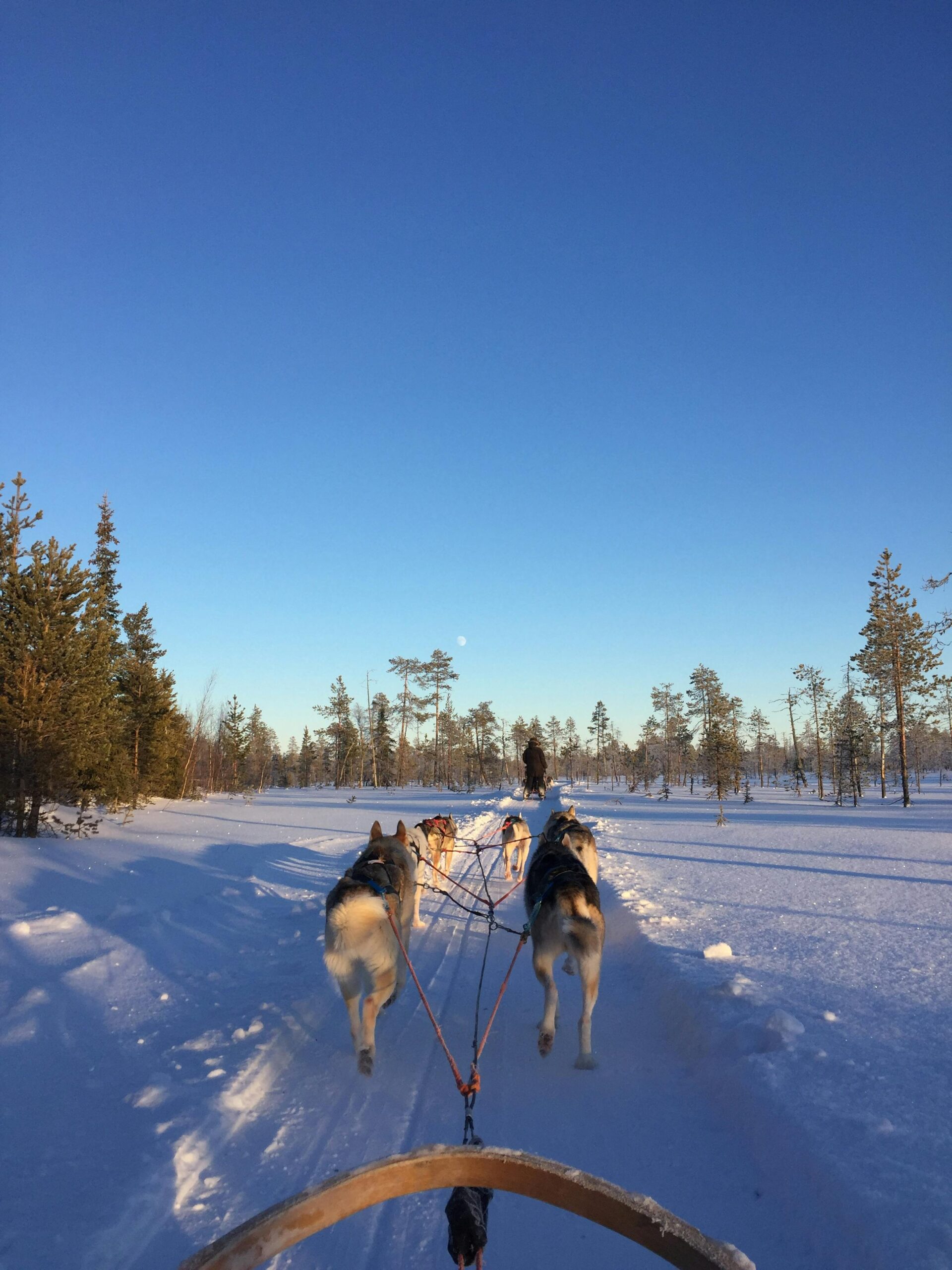 Poczuj dreszczyk emocji podczas jazdy psim zaprzęgiem po śnieżnym krajobrazie pod czystym, błękitnym niebem.