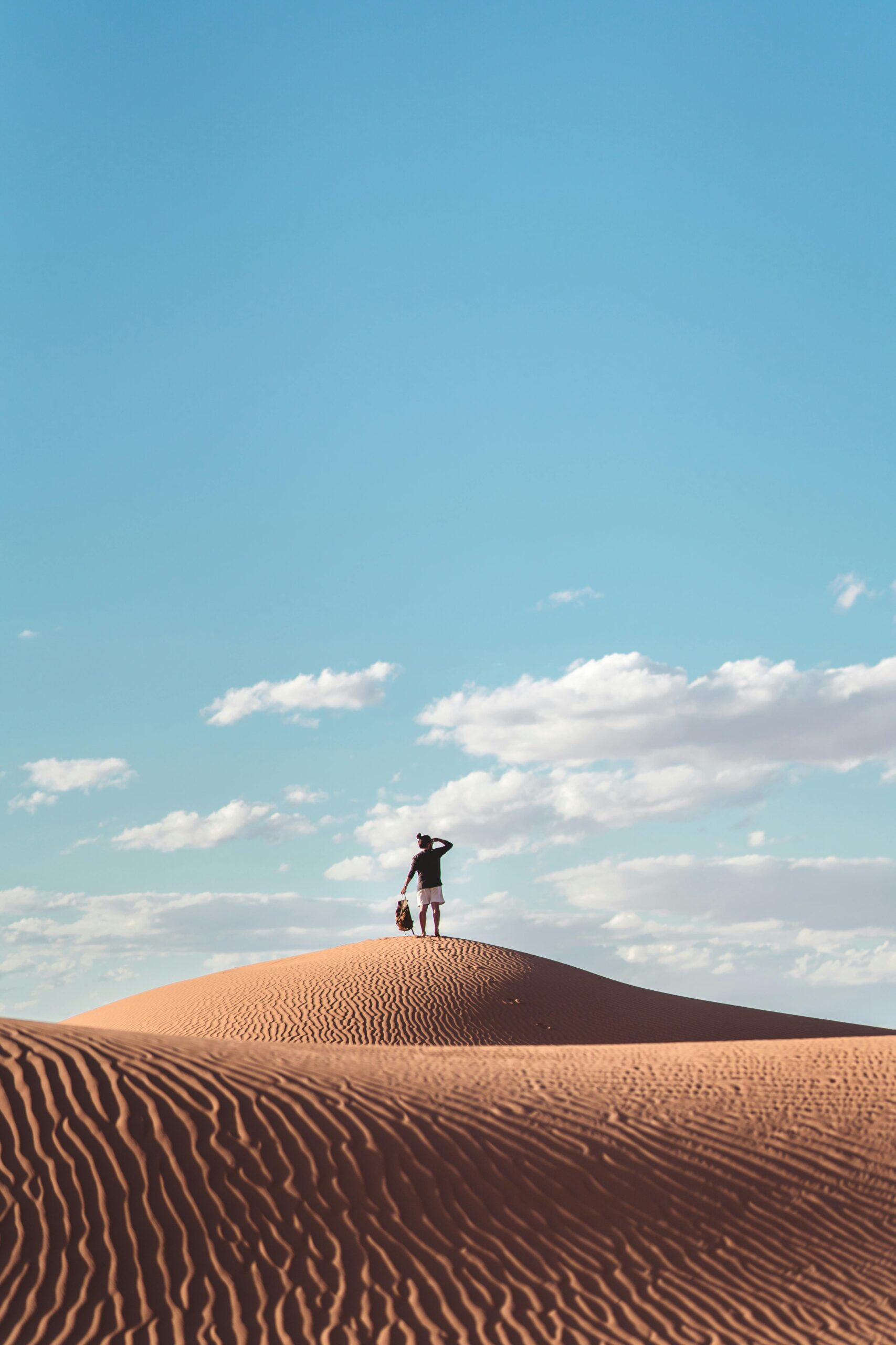 Samotna postać stoi na szczycie wydmy pod rozległym błękitnym niebem na egipskiej pustyni.