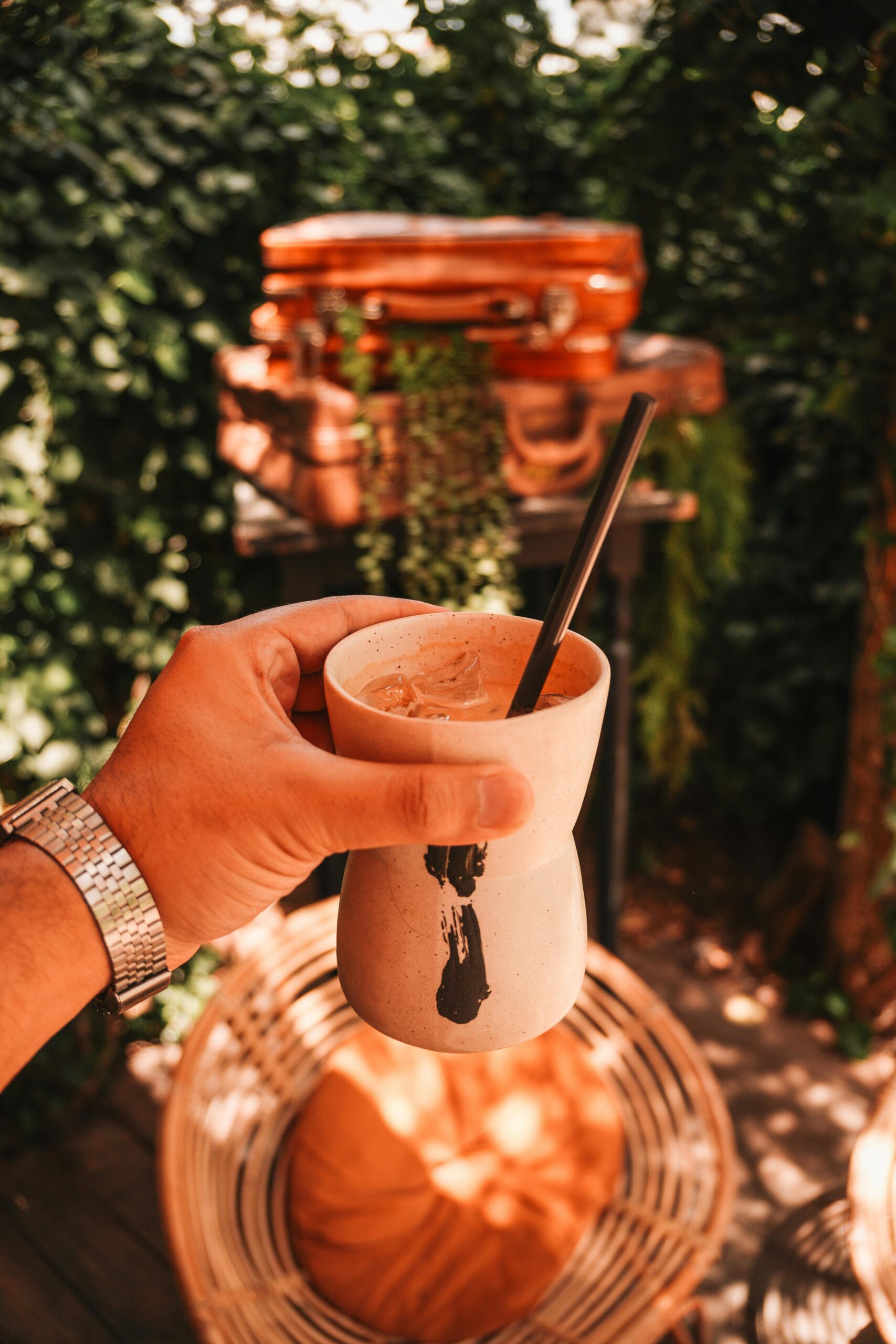Osoba pijąca kawę w stylowej przestrzeni na świeżym powietrzu z bagażem i zielenią.