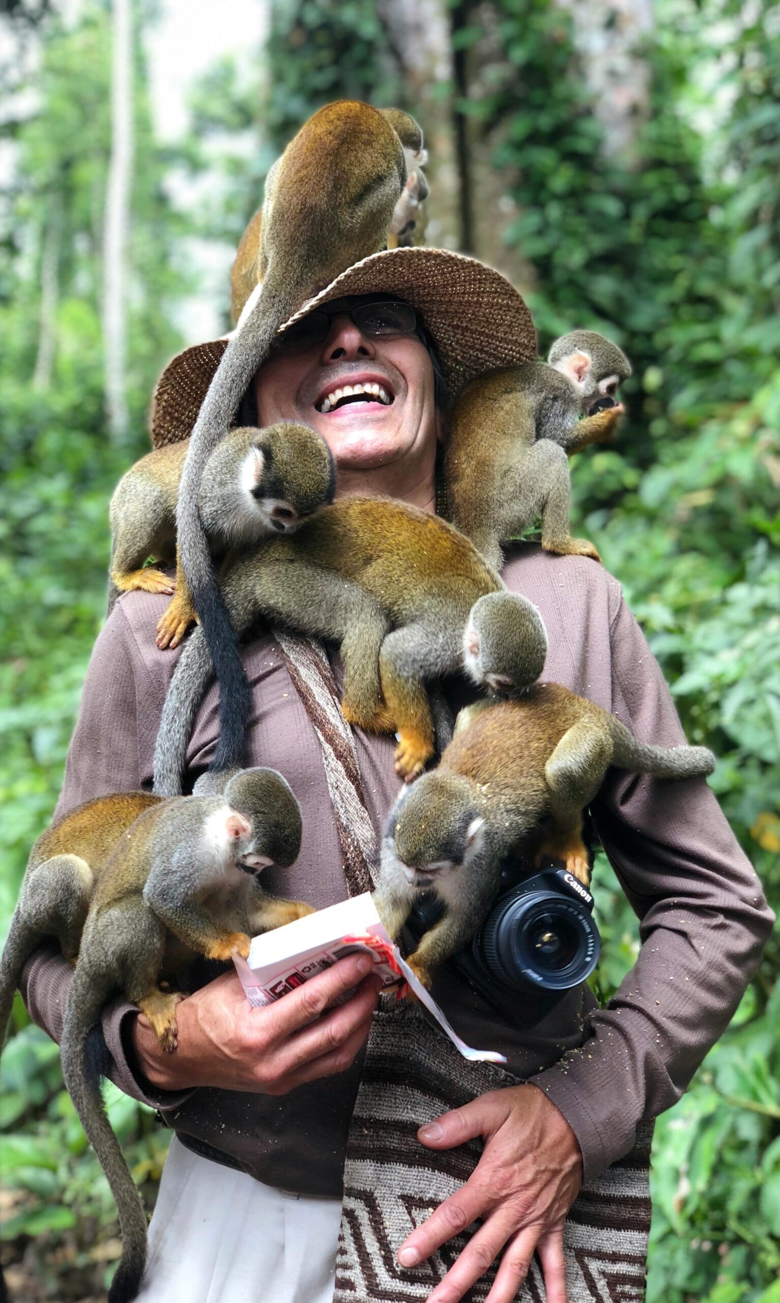 Uśmiechnięta osoba z małpami wiewiórkami na ramionach w amazońskiej dżungli, ukazująca interakcję z dziką przyrodą.