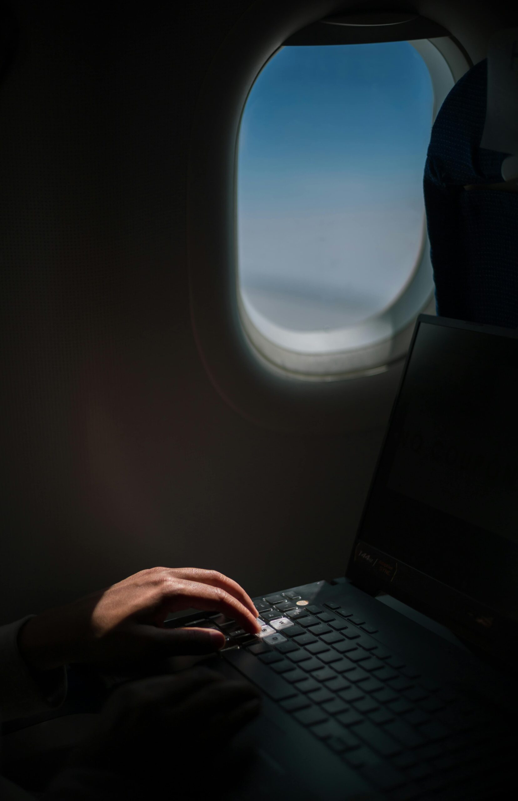 Osoba korzystająca z laptopa podczas lotu i wykazująca produktywne nawyki związane z podróżowaniem.