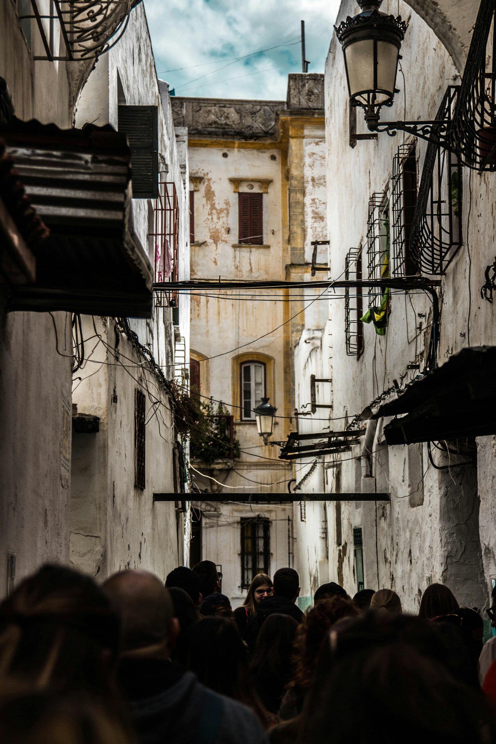 Zatłoczona wąska ulica w starej Medynie w Tetouanie z charakterystyczną marokańską architekturą.