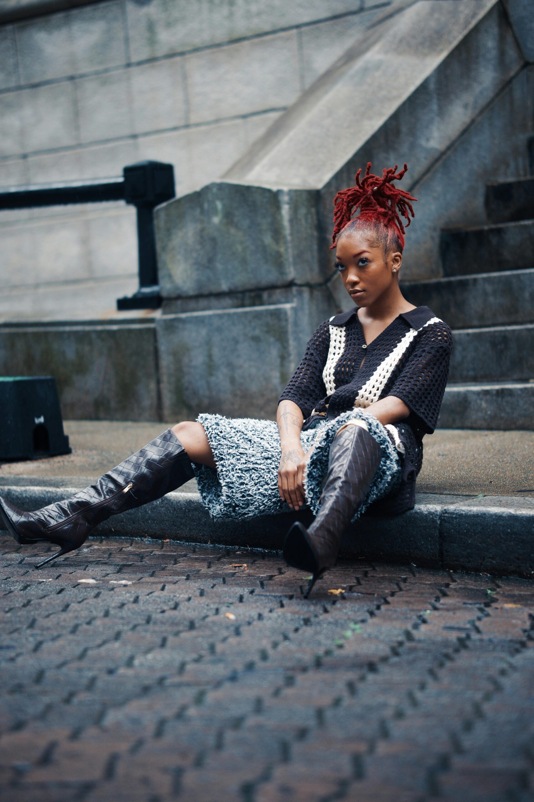 Młoda kobieta o rudych włosach siedząca na ulicy Georgetown prezentuje nowoczesną modę miejską.